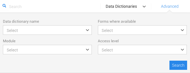 - Búsqueda avanzada: Posibilidad de encontrar información en el Diccionario de datos por formulario.