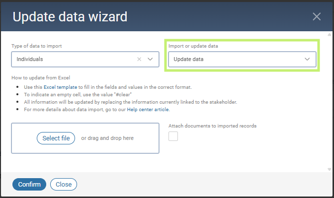 Una vez completado, cargue el archivo de Excel y haga clic en Confirmar.