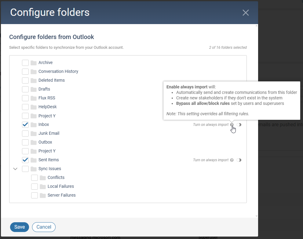 Nota: Puede activar o desactivar la opción Importar siempre para una carpeta específica si desea omitir todas las reglas de permitir/bloquear.Guardar la configuración.