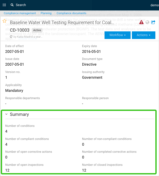 Dans l’onglet Information générale des Documents de conformité, vous pouvez maintenant trouver la section Résumé, qui offre un aperçu de différents indicateurs, incluant le nombre : de conditions, de conditions conformes, de conditions non-conformes, d’actions correctives ouvertes, d’actions correctives complétées, d’inspections ouvertes et d’inspections fermées.