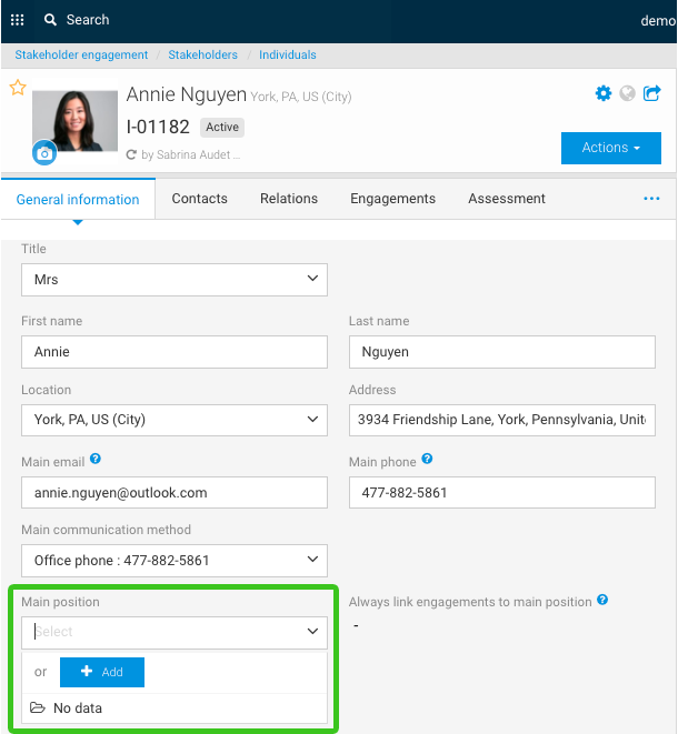 Jusqu’à cette mise à jour, il était impossible de remplir certains champs à partir de l’onglet Information générale d’un individu si ceux-ci n’avaient pas été saisis au préalable. Par exemple, si une Fonction ou une Adresse n’existaient pas déjà dans le système, les utilisateurs devaient d’abord les créer dans leur onglet spécifique pour ensuite les sélectionner dans le menu déroulant dans l’onglet Information générale. Grâce à cette fonctionnalité, la mise à jour de l’information des parties prenantes sera plus rapide.