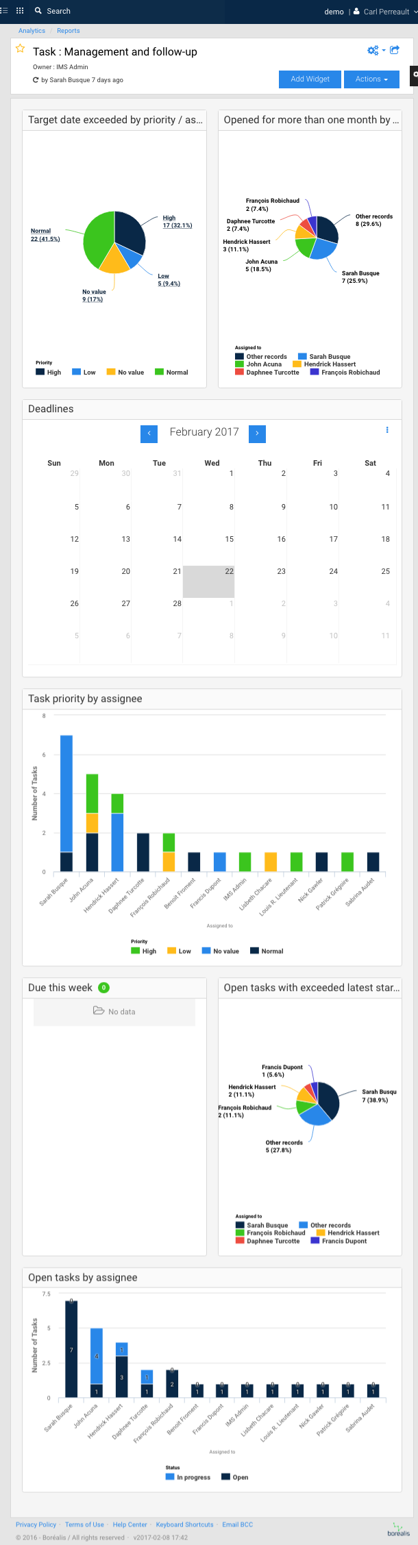 Mes tâches : Ce tableau de bord fournit un survol de vos tâches en tant qu’utilisateur de Boréalis, incluant les tâches dont la date butoir est dépassée, qui sont ouvertes depuis plus d’un mois, les échéances, les tâches assignées et les tâches ouvertes sans date butoir.