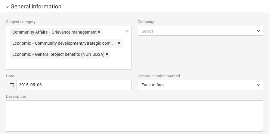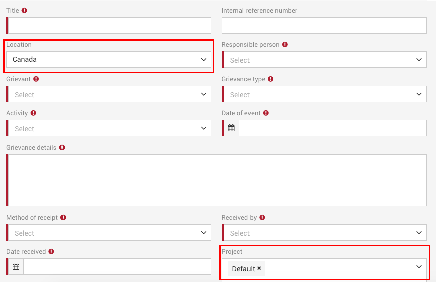 - Les champs localisation et projet sont remplis automatiquement dans certains formulaire d'ajout, tel que l'ajout de plaintes à partir d'une réunion.