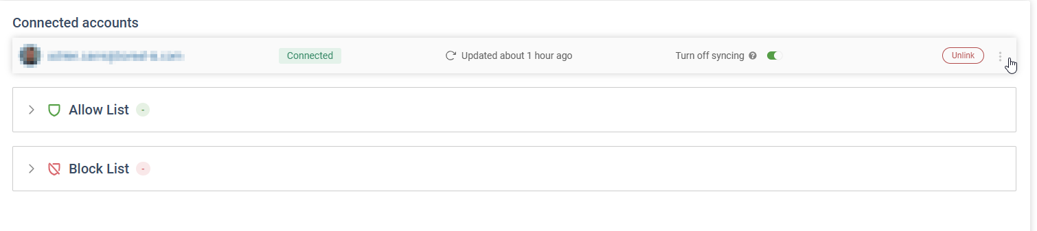 Une fois connecté, votre adresse courriel apparaîtra et affichera l’état Connecté, ainsi que d’autres actions pour configurer vos listes d’autorisation et de blocage, gérer les abonnements aux dossiers, synchroniser les courriels passés.